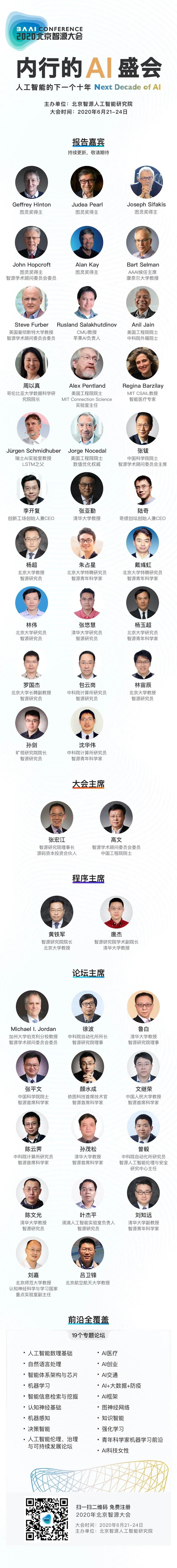 2020年6月21-24日第二届北京智源大会官网:https://2020.baai.ac.cn)将邀请包括6位图灵奖获得者、10多院士在内的上百位人工智能领袖,回顾过去,展望未来,深入系统探讨“人工智能的下一个十年”。