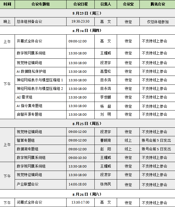日期:8月21日开始签到,8月22日召开工作组标准讨论会,8月27日召开工作总结大会。总体组预备会议将于8月23日(周三)19:30召开;开幕式全体会议将于8月24日(周四)9:00召开;闭幕式全体会议将于8月26日(周六)13:30召开,欢迎各会员单位派出代表参会。